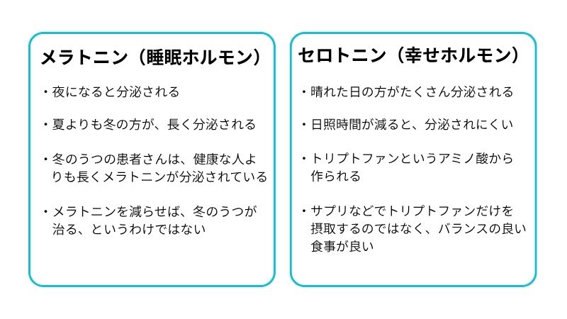 冬のうつの患者さんは、冬のうつではない人に比べると、26分も長くメラトニンが作られていることがわかったそうです。このことから、冬にメラトニンが長く分泌されることで、うつ症状を誘発するという仮説もあります。